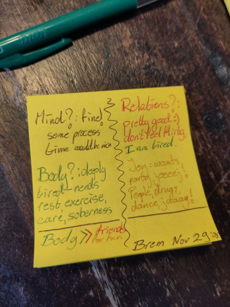 Since I know I prioritise body > mind > relationships > joy > work; I knew that if the body had conflicting needs with friends and joy, I should choose what’s best for the body.